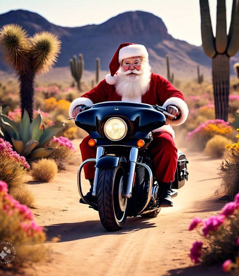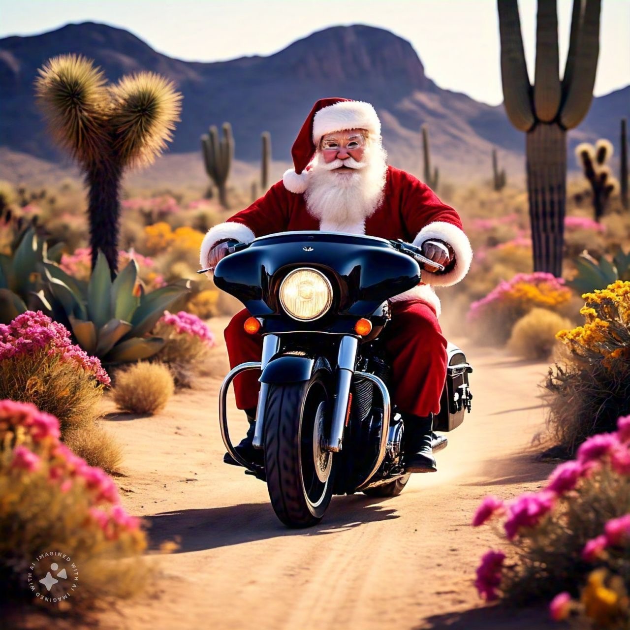 When the open road calls, Santa hops on his motorcycle for a thrilling ride through vast desert landscapes. With the warm breeze in his beard and the vibrant cactus flowers lining the way, he enjoys the freedom and adventure of exploring the great outdoors. It’s his way of embracing a different kind of magic—one found in the beauty of nature and the joy of the journey.